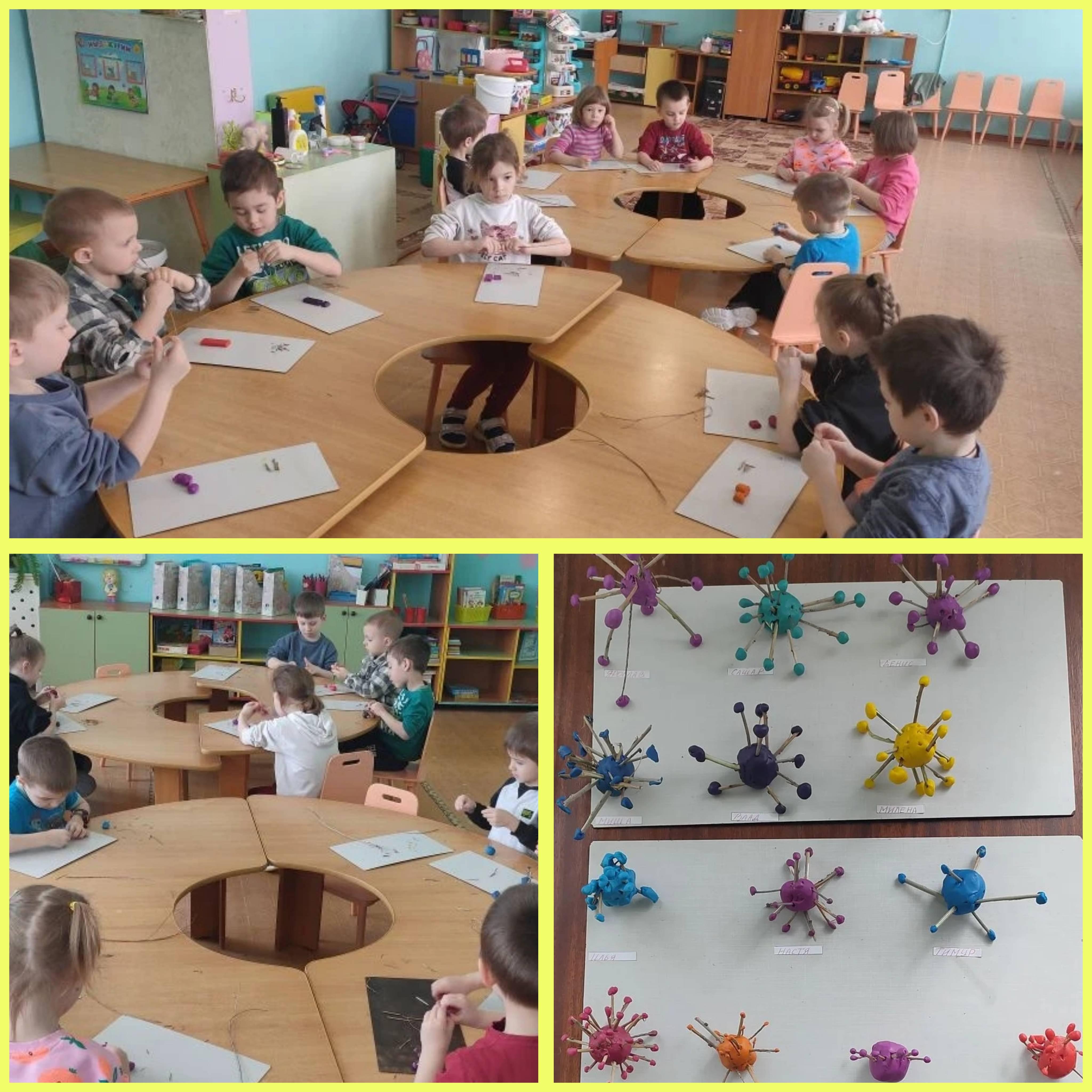 Ребята из старшей группы «Жар‑птица» узнали интересные факты о микробах: где они живут, какую роль играют в природе и жизни человека. Затем юные учёные проявили фантазию и мастерство — на занятии по лепке они создали собственных микробов, придав абстрактным микроорганизмам самые необычные и причудливые формы.