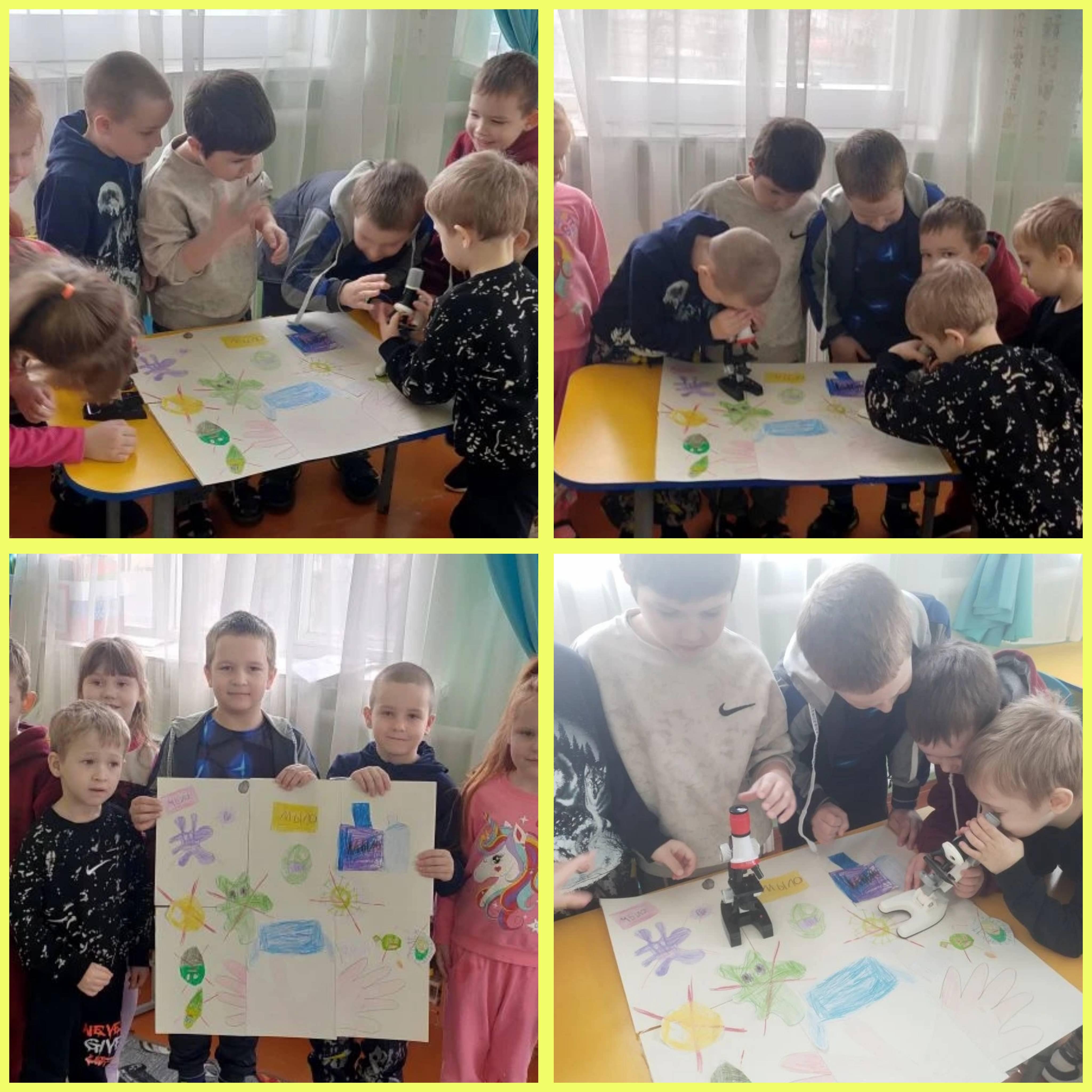 Вернувшись в группу, юные исследователи взяли в руки микроскопы. Через увеличительные стёкла они с любопытством рассматривали разные виды бактерий и микробов.